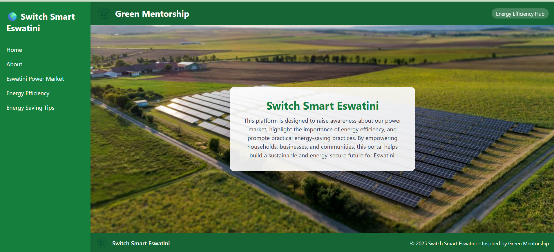 During the cohort, I worked on a project titled “Switch Smart Eswatini: Power Market and Energy Efficiency” The project focused on addressing Eswatini’s heavy reliance on imported electricity by promoting energy efficiency as a demand-side solution. I developed a web application: (https://